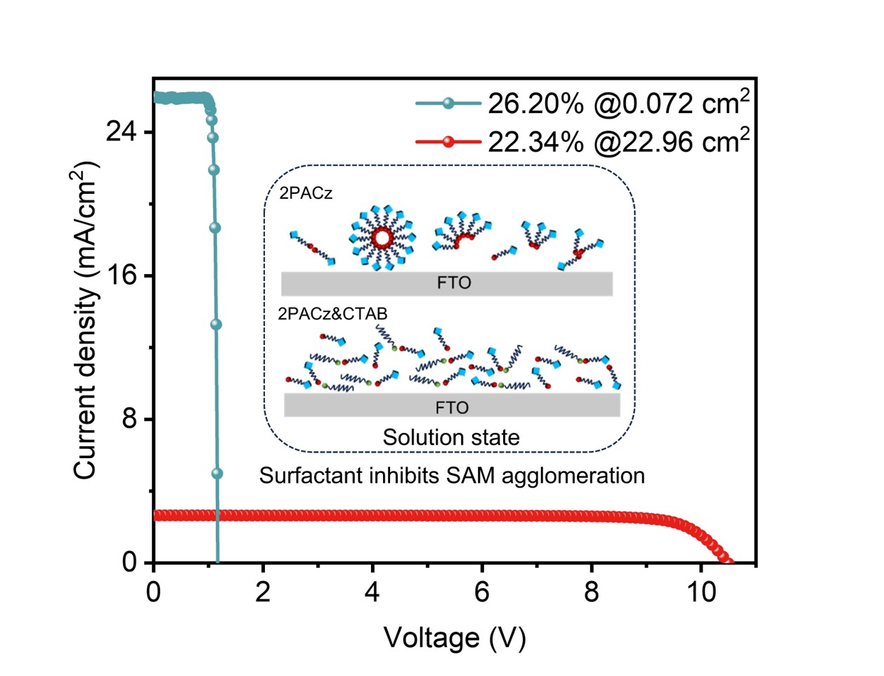 钙钛矿太阳能电池作为新一代光伏技术,基于p-i-n型器件效率已突破26%,其中SAM作为空穴传输层起到关键作用。然而,SAM分子在沉积过程中易发生聚集形成胶束,导致薄膜覆盖不连续、界面缺陷增多,制约了器件性能与大面积制备。针对该问题,研究团队创新性地采用非自组装、非导电的低成本常规表面活性剂CTAB,并通过理论计算结合实验表征证明CTAB与2PACz之间的静电非键合相互作用,抑制了SAM分子团簇化,促进了SAM在基底上的均匀分散与稳固锚定,实现覆盖完整、均匀的高质量SAM薄膜。最终采用CTAB修饰SAM的p-i-n型钙钛矿太阳能电池实现了26.20%的光电转换效率(活性面积0.072 cm²),其开路电压、短路电流密度和填充因子均得到显著提升。此外,基于该策略制备的大面积组件(22.96 cm²)效率达到22.34%,且器件在连续最大功率点跟踪800小时后仍保持80%以上的初始效率,展示出良好规模化制备潜力与运行稳定性。该研究为钙钛矿太阳能电池界面工程提供了新思路,通过简单、易得的表面活性剂调控策略,有效解决SAM聚集问题,有利于推动高效、稳定、大尺寸钙钛矿光伏器件的发展。