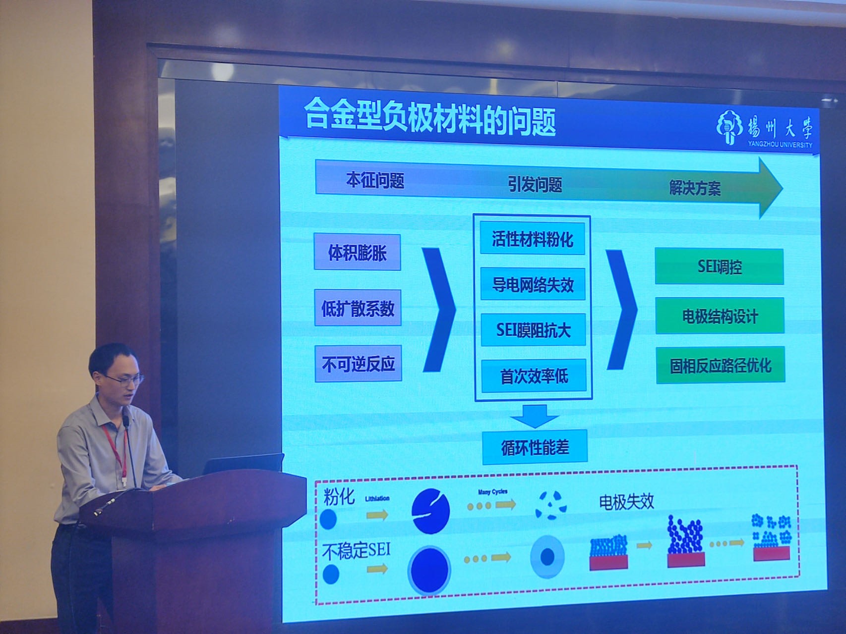 我院储能团队教师代表张晶博士受邀参加了此次会议,张晶博士结合团队和自身科研方向,在钠电池分会场进行了题为《钠/钾离子电池关键电极材料设计与反应机制研究》的特邀报告。钠/钾离子电池合金型负极材料在充放电过程中的体积变化大,引起活性材料的破碎和粉化,降低了SEI膜的稳定性,导致电池极化加剧、库仑效率下降、循环稳定性变差等技术和科学难题。针对这些问题,张晶博士从SEI调控、电极结构设计、固相反应路径优化等方面入手,提升了合金型负极材料循环寿命,重点探讨了充放电过程中电极结构及表界面变化、离子和电子传输、相转变等科学问题。会议期间和多位专家学者进行了深入交流与学习,专家们对张晶博士已取得的研究进展和成果表示了高度赞赏和一致好评。