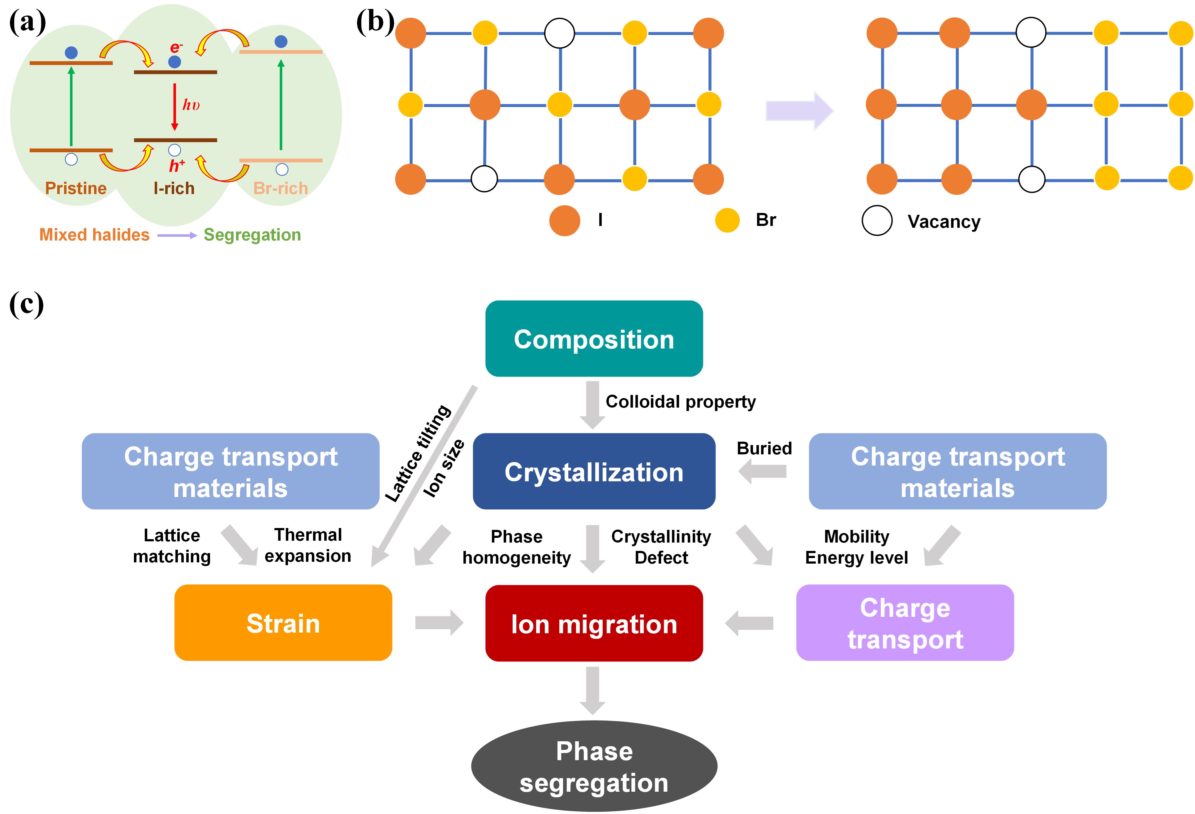 1. a)相分离钙钛矿中的电荷复合行为;(b)离子迁移导致相分离;(c)影响相分离的关键因素