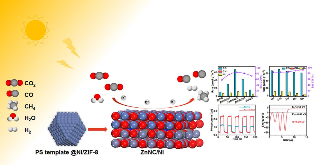通过在MOF衍生的ZnO中引入NiO来构建N、C掺杂的Zn-Ni双金属复合催化剂,并调整复合催化剂的形态基序来促进电荷的分离和转移,可以使光催化产物合成气具有可调节的成分比例。发现ZnNC/Ni具有更宽的光吸收范围,更快的光诱导载流子的分离和迁移效率,从而表现出增强的光催化活性和良好的稳定性。本研究为MOF衍生的双金属复合催化剂光还原CO2以提高CO2光还原活性和产物选择性提供了新的见解。本研究得到了国家自然科学基金委的资助。