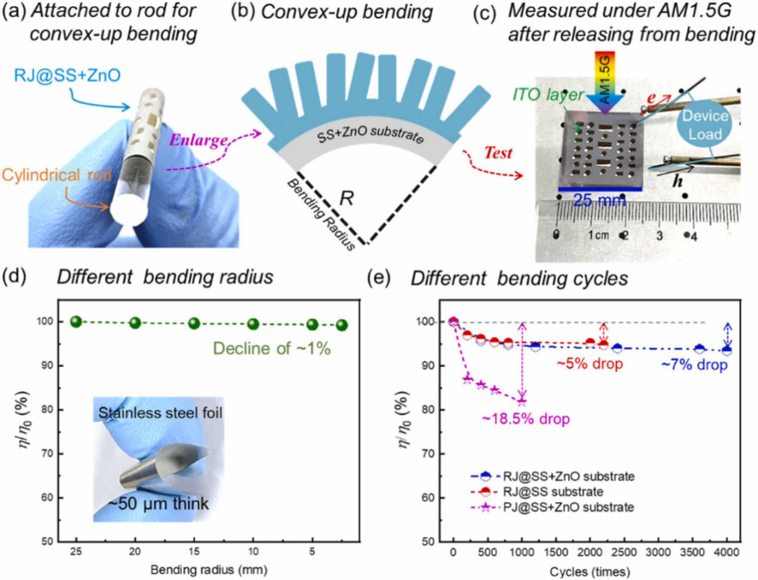 直接生长在柔性衬底表面的硅纳米线阵列可以对后续沉积的薄膜起到支撑作用,使其远离应力集中的柔性衬底表面,避免了薄膜在衬底形变时发生破裂,甚至剥离。随机分布、取向的三维径向结可以限制弯曲应力所产生的裂纹仅在径向结与径向结之间的平面区域扩散,或穿过径向结单元灌木丛,或从径向结单元侧边通过,或被径向结单元所阻。同时,站立着的径向结单元具有抑制裂纹无限制扩展的功能,尤其是在本工作中,随着ZnO层的沉积,纳米线具有更高密度且更多的“短桩结构 (Short stump structures)”像“灌木丛”一样阻止长而连续的大裂纹形成,将裂纹分散成局部的、细小的状态,使柔性薄膜器件具有优异的耐弯曲力学特性。在经历过弯曲4000次(弯曲半径仅为2.5 mm)的凸弯曲后,在沉积ZnO层的不锈钢衬底上制备的径向结光电器件仍能保持93%的初始性能,如图2所示。该工作突出与工业成熟PECVD技术兼容的潜力,建立耐弯曲的高性能柔性光伏技术,以满足蓬勃发展的对轻便可穿戴器件的市场需求。